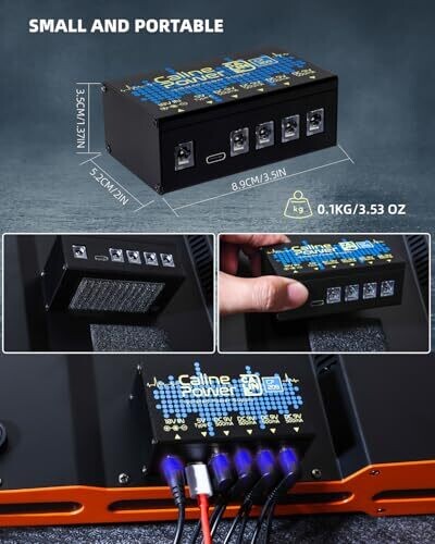 The product is a totally isolated power supply where each output is individually isolated to prevent crosstalk between pedals. It provides four 9V DC outputs, each capable of up to 500 mA, and includes a four‑way daisy chain cable. A Type-C output is available for charging compatible devices and expanding versatility. The unit measures 3.5 x 2 x 1.38 inches and weighs approximately 100 g. It includes short‑circuit protection on each output and mounting straps for securing the unit to a pedalboard, enabling a compact and organized setup.