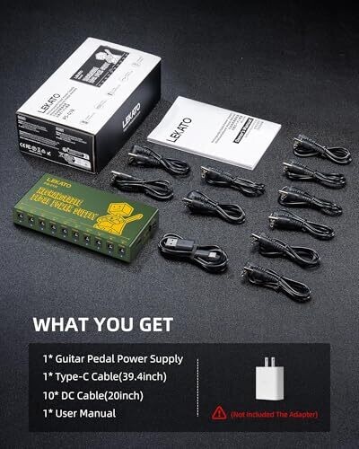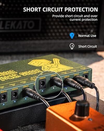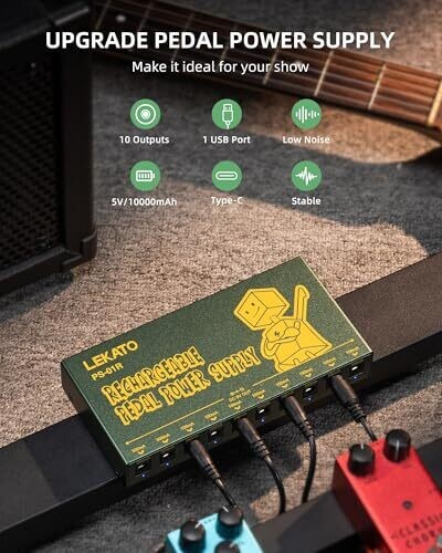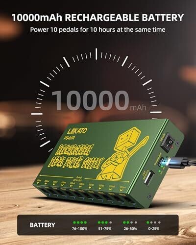 The LEKATO Guitar Pedal Power Supply is rechargeable and portable, with 10 independent outputs to power diverse pedalboards. It includes short-circuit protection for safer performances and a compact design ideal for road use.