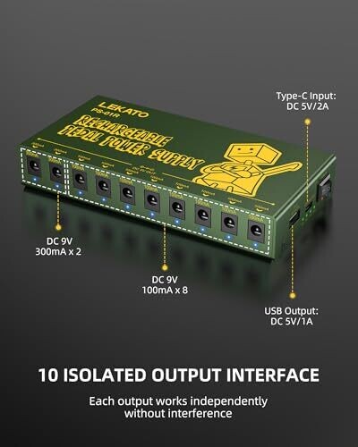 • LEKATO Guitar Pedal Power Supply - Rechargeable, 10 Independent Outputs, Short-Circuit Safe