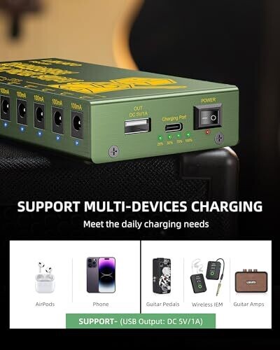 Rechargeable guitar pedal power supply; 10 independent circuit outputs; Short circuit protection; Portable size