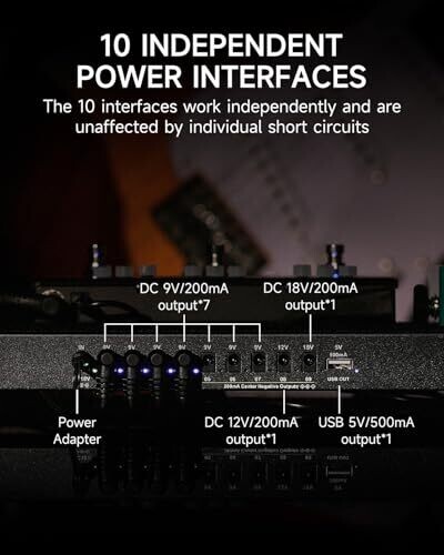 Power interfaces include seven 9V outputs, independent 12V and 18V 200mA options, and an additional USB port delivering 5V 500mA for charging devices.
