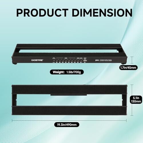 The Ghost Fire PP series pedal board is made of ultra-lightweight aluminum alloy material, weighing 1.5 lb, with dimensions of 19.3 inches by 5.1 inches. It provides 9 output interfaces for guitar pedals and 1 USB output/input interface. The pedal board features a built-in power supply with 9-way output plus USB input/output. The design includes an anti-noise circuit to deliver clear, noise-free sound. The enclosure uses 5052 aluminum alloy with precision-cut custom molds, a sandblasted and sprayed surface, and high-hardness ABS rounded corner parts to prevent scratching of the pedal bag. Accessories include: