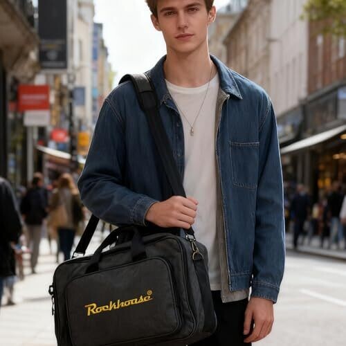 Rockhouse Effects pedal bag keeps pedals organized and protected with water-resistant fabric, shock-absorbing padding, and sturdy zippers. It features two compartments and a mesh pocket for cables and accessories, plus a comfortable strap for secure, on-the-go transport.