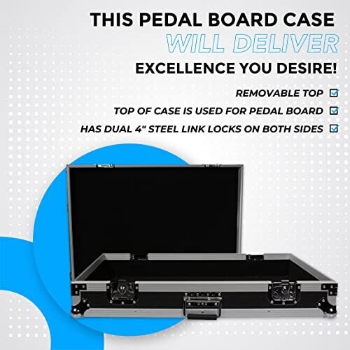 A rugged, tour-ready pedal board case that protects and organizes your gear. Its light yet heavy-duty chassis, removable top, and top surface for boards keep items accessible. Steel rails, reinforced corners, dual locks, and secure handles ensure reliable transport on any road.