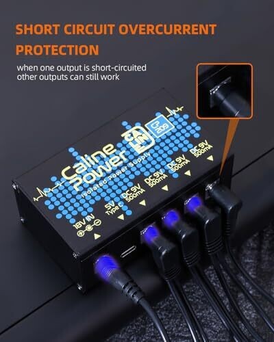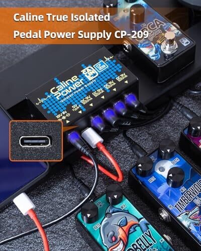 Caline’s compact pedal power supply delivers clean 9V DC power for multiple effects with isolated outputs to prevent hum and interference. It provides four high-current 9V outputs (up to 500mA each), plus a Type-C port for charging and accessories.
