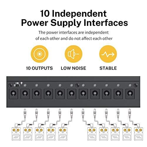 • 10 isolated DC outputs provide independent, reliable power for a versatile pedal setup