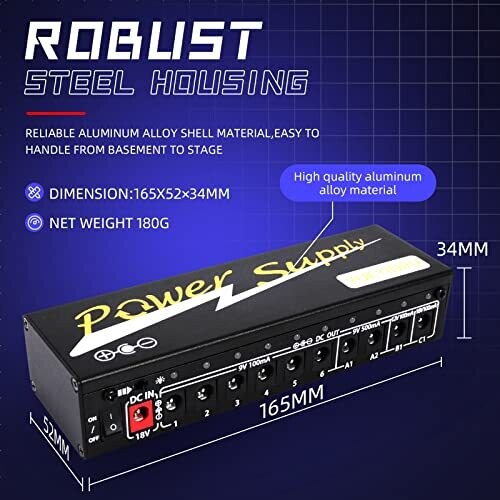 Power your guitar rig with a dedicated pedalboard supply. Ten isolated outputs reduce crosstalk and noise, with safe independent short-circuit protection for each channel. Compact aluminum housing, blue indicators, includes adapter and cables for on-stage setup.