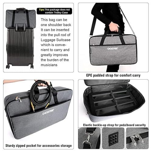 The Ghost Fire S series pedal board is made from 5052 aluminum alloy with a surface that is sandblasted and sprayed. Dimensions are 19.8 inches by 11.5 inches (approximately 50.3 cm by 29.2 cm), and the weight is 1.76 lb (0. Eight kilograms). The board can accommodate 8–10 effects pedals. It includes a patented, ergonomically designed tilting foot stand that can be opened for use and folded for storage. A 3.8 cm wide loop magic tape is pre-fixed on the board for securing pedals; hook tape is included to attach to the back of pedals as needed. A large-capacity storage bag offers an internal fixed strap for the pedal board and an external side pocket for cables; the bag can be carried as a handbag or shoulder bag and can be fixed to a suitcase pull rod for travel. The board uses ultra-hard ABS rounded corner parts to prevent bag scratches and enhance durability and aesthetics.