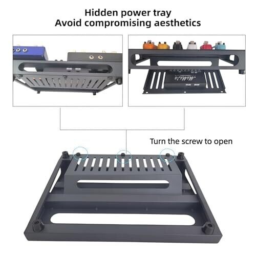 Dedicated power supply tray keeps cables and adapters stored, reducing clutter for a cleaner setup.