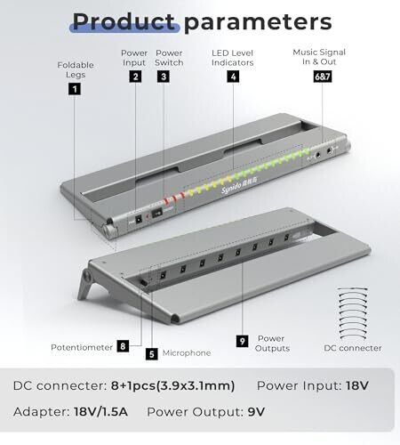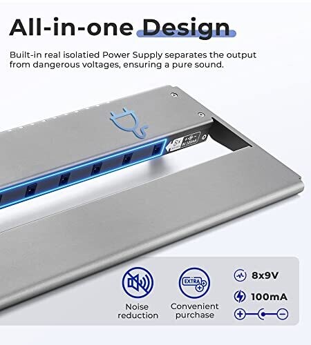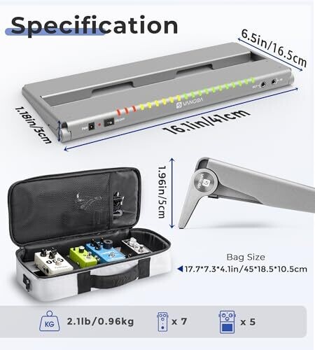 Vangoa’s pedal board features an isolated power supply in a lightweight aluminum frame. This small, portable folding unit weighs 2.8 lb and comes with a carry bag. Compact size: 16.1'' x 6.5'', silver finish, ideal for gigs.